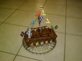 Die Fahnenmasten einstecken, die Gallionsfigur auflegen und die Seeräuber-Mannschaft auf dem Schiff verteilen. Nach dem Abkühlen das Segel anbringen und die Segelhalterungen spannen.